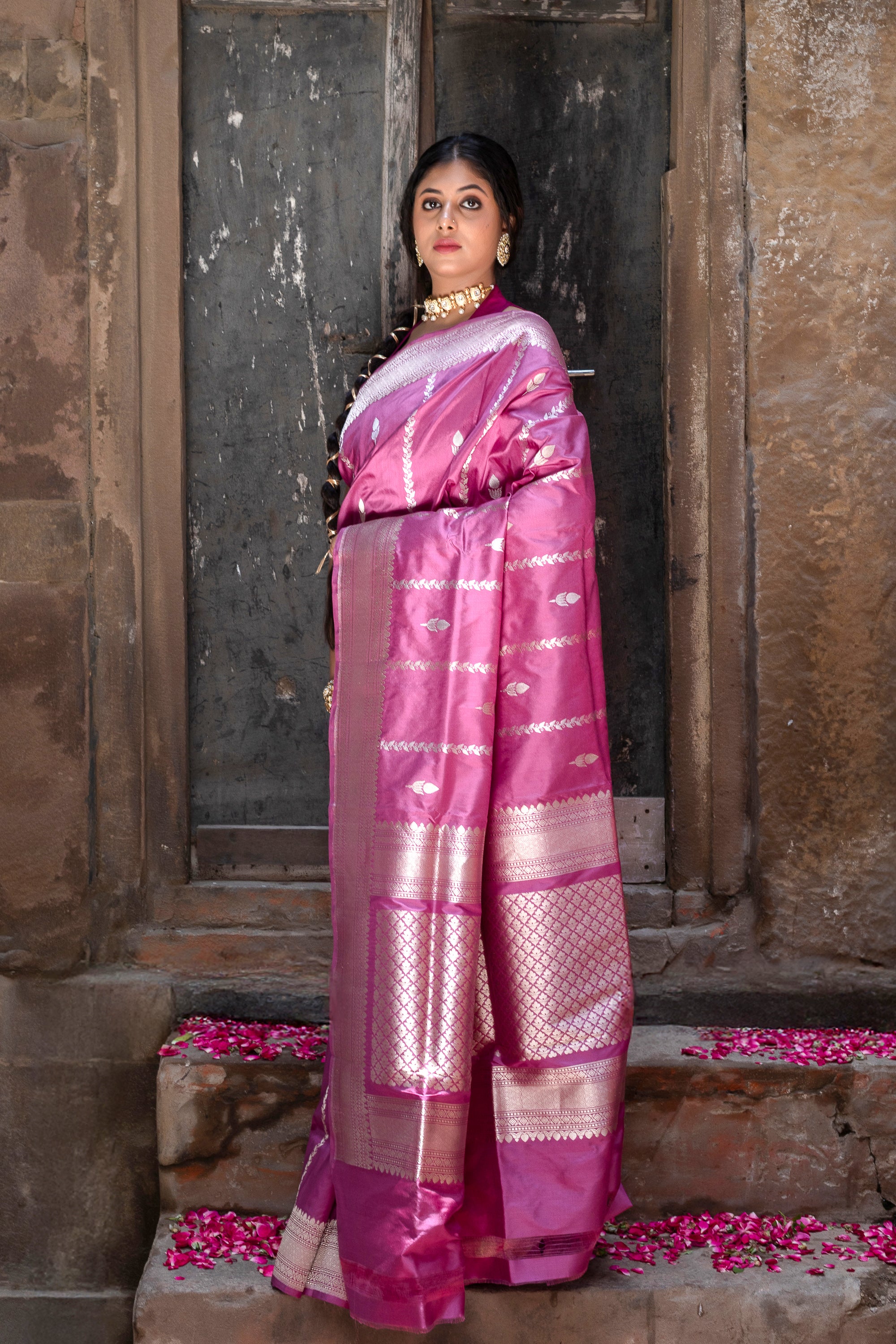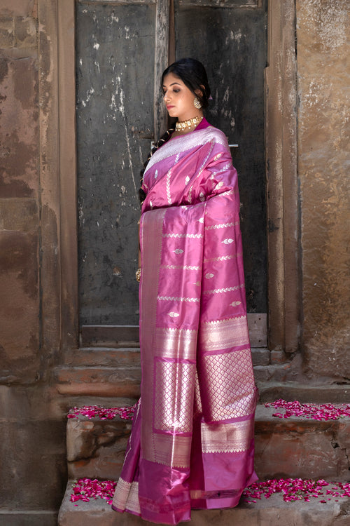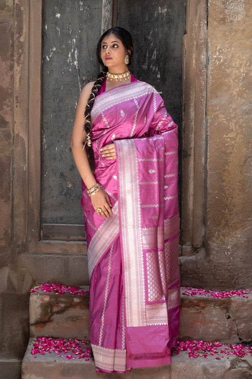 Pure Katan Banarsi Handloom - Booti & Stripes